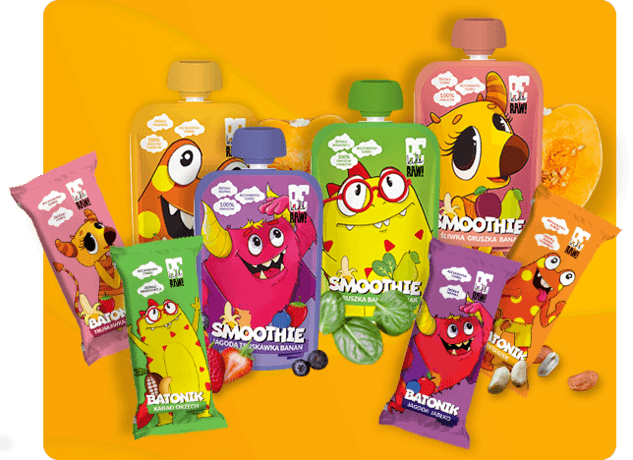 cztery smaki batonów i cztery smaki smoothie owocowo-warzywnego w formie musów w saszetkach oraz cztery smaki żelek na bazie soków owocowych bez dodatku żelatyny i cukru.