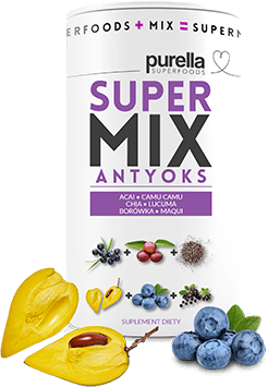 Supermix Antyoks suplement diety to kompozycja SUPERFOODS, które pomagają dostarczać do organizmu składniki o właściwościach antyoksydacyjnych. Zawiera min. borówkę, która jest źródłem naturalnych przeciwutleniaczy, a także jagody camu camu, bogate w witaminę C. W jego składzie znajdują się też: owoce lucumy, nasiona chia, sproszkowany sok z jagód acai oraz jagody maqui.