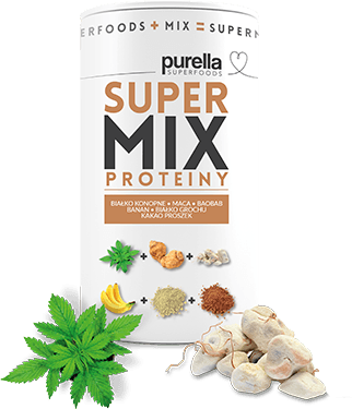 Supermix Proteiny suplement diety to mieszanka składników SUPERFOODS, która charakteryzuje się wysoką zawartością białka. Białko zaś wspiera przyrost masy mięśniowej. Zawiera: białko konopne, białko grochu, baobab, kakao i sproszkowany przecier bananowy. Nie zabrakło też dobroczynnych właściwości korzenia maca. Jest to produkt wysokobiałkowy.