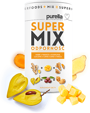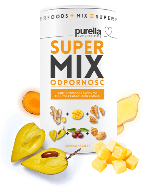 Supermix Odporność suplement diety to mieszanka SUPERFOODS stworzona specjalnie po to, by wspierać pracę układu odpornościowego. W składzie znajdują się: kurkuma, imbir i mango, które pozytywnie działają na system immunologiczny. Mieszanka zawiera także: owoce lucumy, korzeń maca. Ważnym składnikiem są tutaj owoce camu camu, które są bogatym źródłem witaminy C, pomagającej w utrzymaniu prawidłowego funkcjonowania układu odpornościowego.