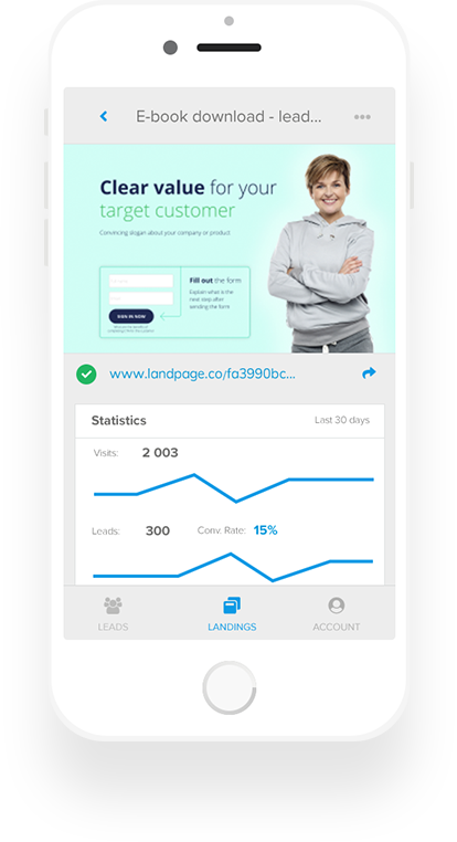 A landing page visualization, quick access to its link, seamless access to statistics. User-friendly navigation due to a slick mobile interface.
