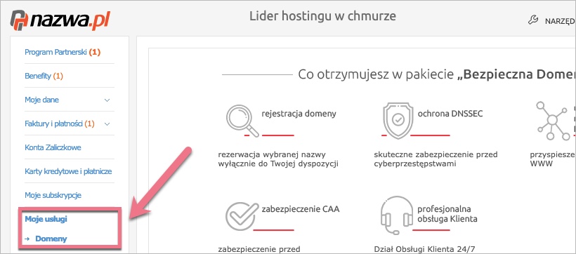 1. Zaloguj się do swojego panelu klienta w nazwa.pl i przejdź do zakładki Moje usługi > Domeny.