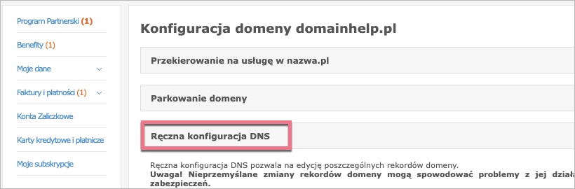 3. Przejdź do zakładki Ręczna konfiguracja DNS.