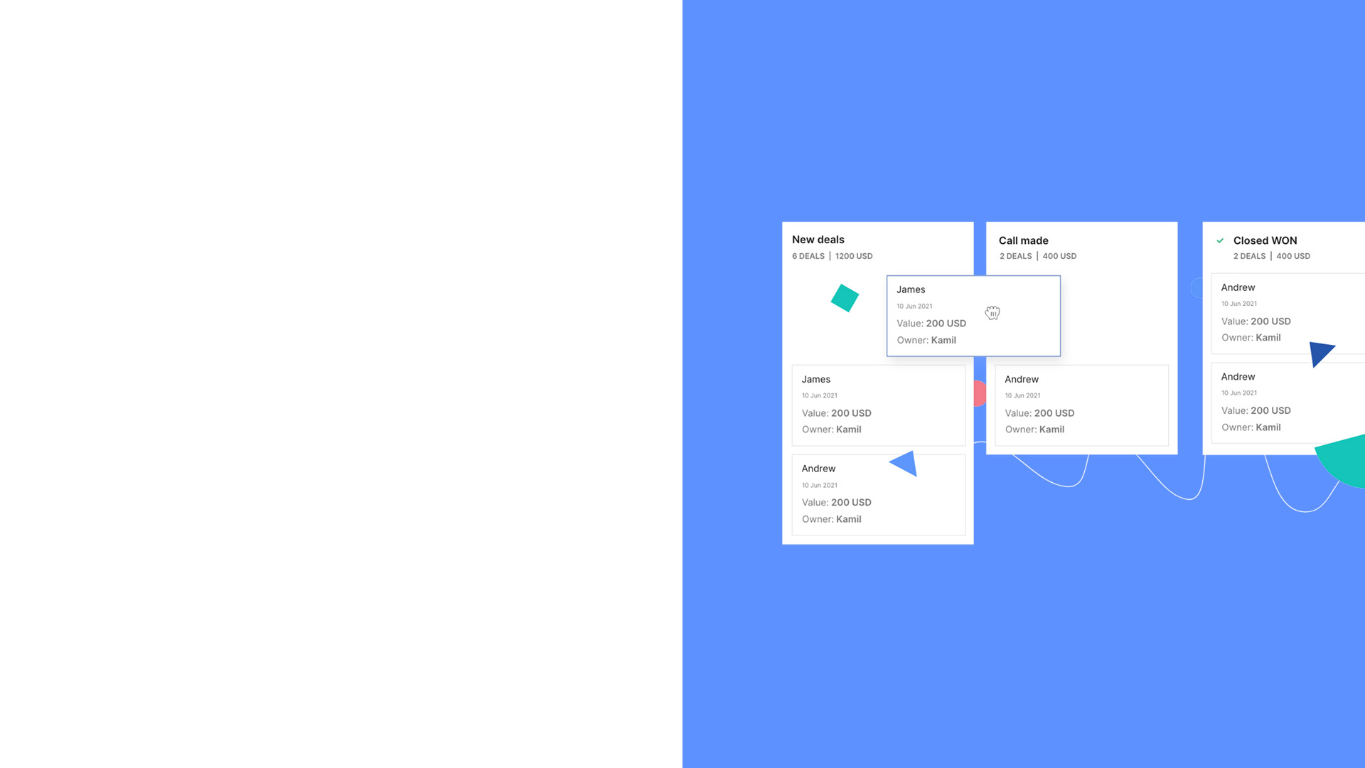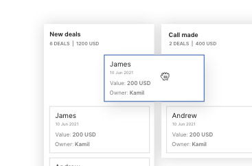 Deals are your potential buyers. Add new deals, set values, and track them through your pipeline stages. Close the deal and mark it as Won!