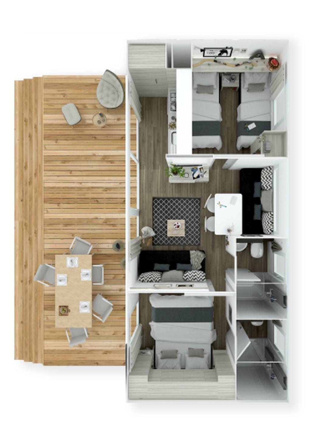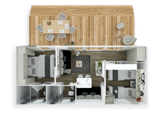 Mobilne apartamenty o standardzie hotelowym 5-gwiazdek, posiadać będą co najmniej dwie sypialnie, przestronny taras oraz bogate wyposażenie zapewniające pełen komfort.